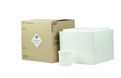 ‘620 /650 Insulated Specimen Transport Pack’ with fibreboard outer box, EPS insulating box, corflute stabilising insert, re-sealable plastic bag (Primary Receptacle), 1.1 L HDPE round jar with 115 mm screw closure and plug insert (Secondary Package) and 4 x absorbent pads for transport with chilling mediums or at ambient temperature.